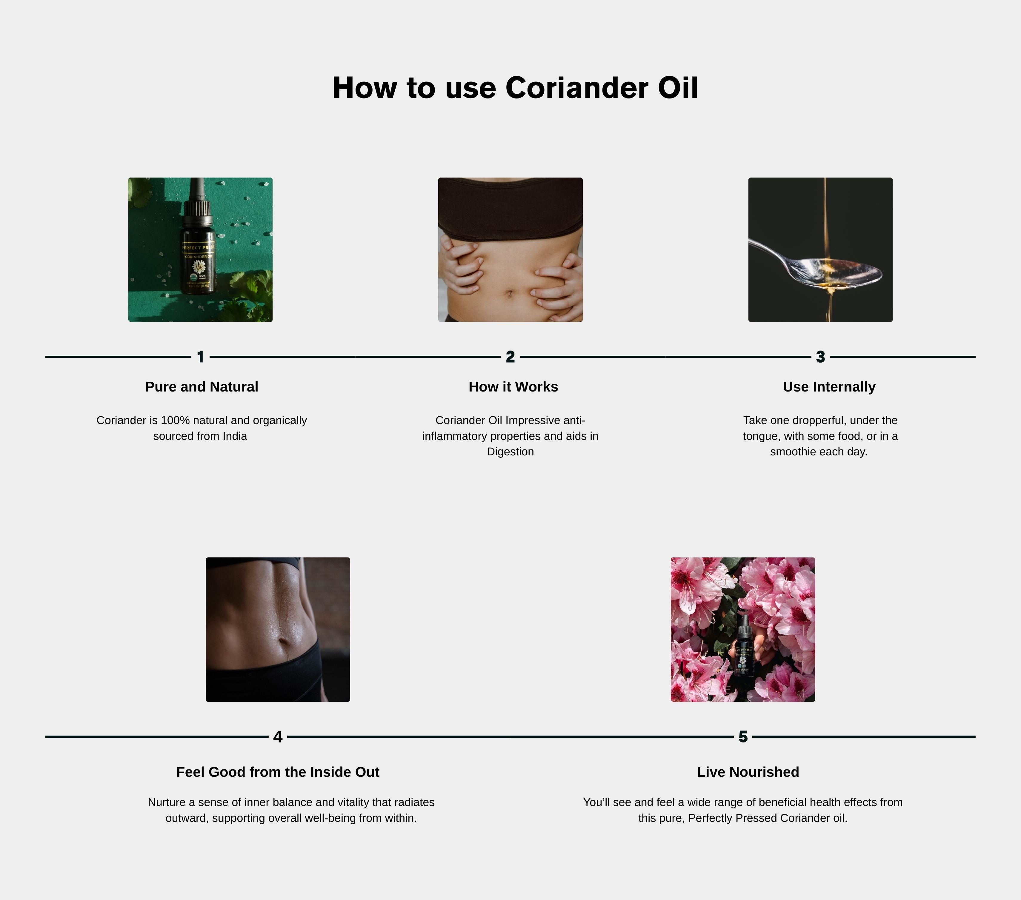 Each bottle of Perfect Press® Coriander Oil contains the oil from thousands of organic coriander seeds sourced from Egypt. Our unique and proprietary heat-free pressing process ensures there’s no damage to the nutritional properties.