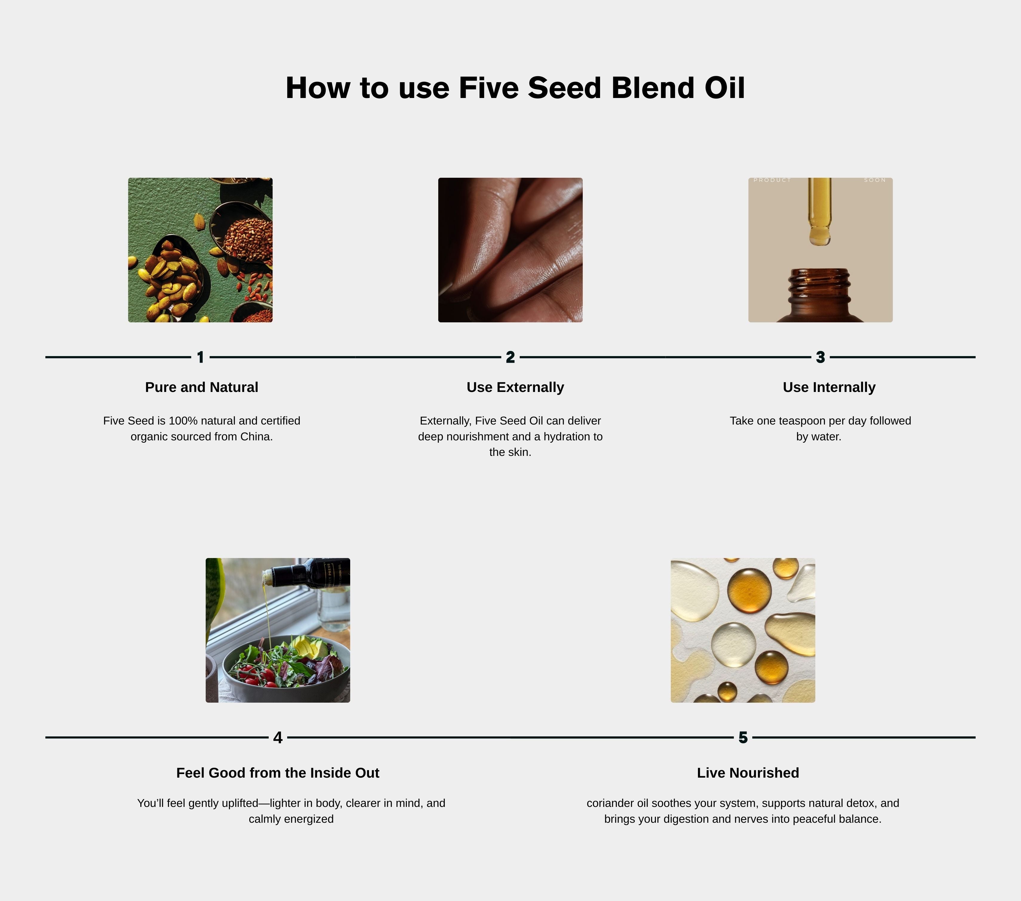 Five Seed Blend is a rich, cold-pressed oil made from black cumin, coriander, black sesame, milk thistle, and pumpkin seeds. It delivers essential fatty acids, antioxidants, detox support, and hormone-balancing nutrients—all in one powerful daily formula.